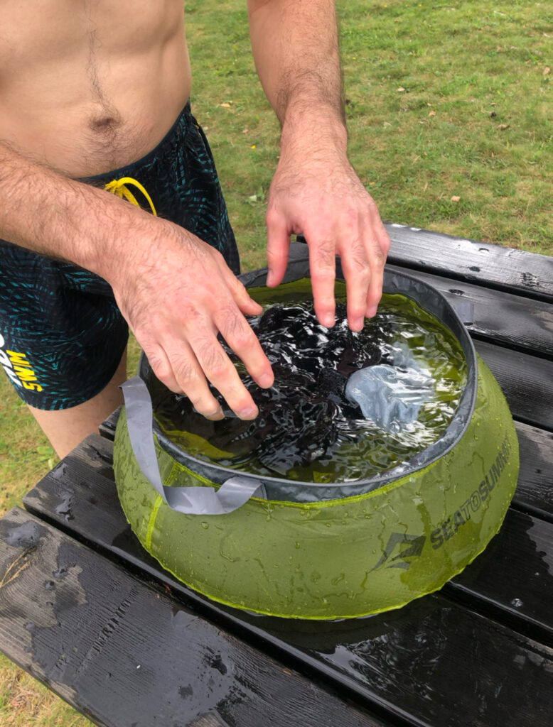 La température de l’eau ? Pire que la Manche au printemps. Nous lavons notre linge dans notre bassine prévue à cet effet avec notre lessive/liquide-vaisselle/ dentifrice/gel-douche biodégradable.