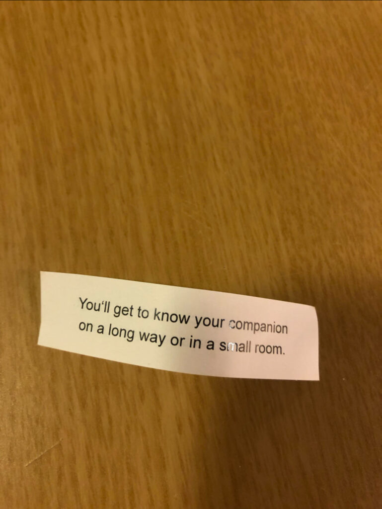 Nous mangeons dans une resto de cuisine fusion asiatique nommé « Made in China ». Assez classe et sobre. Mapo Tofu, Pak choy, raviolis et kimchi cheese balls. C’était EXCELLENT. Mention spéciale au kimchi cheese balls. Mon biscuit de la fortune a été très juste dans un contexte de Road trip où l’on dort dans une tente
